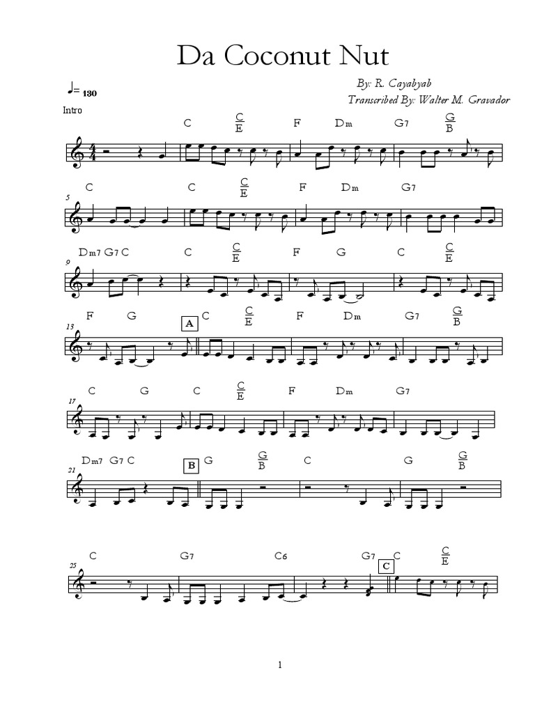 If you eat too much youll get very fat. C-F-G-C- C-F-G break FC C-F-G-C-F-G-C F The coconut nut is a giant nut G C If you eat too much youll get very fat C F Now the coconut nut is a big big nut G break F C But this delicious nut is not a nut Chorus G C Its the coco fruit its the coco fruit G C Of the coco tree of the coco tree G F C From the coco palm family Adlib. THE COCONUT SONG DA COCONUT NUT Ryan Cayabyab Smokey Mountain Lyrics and Chords Intro.